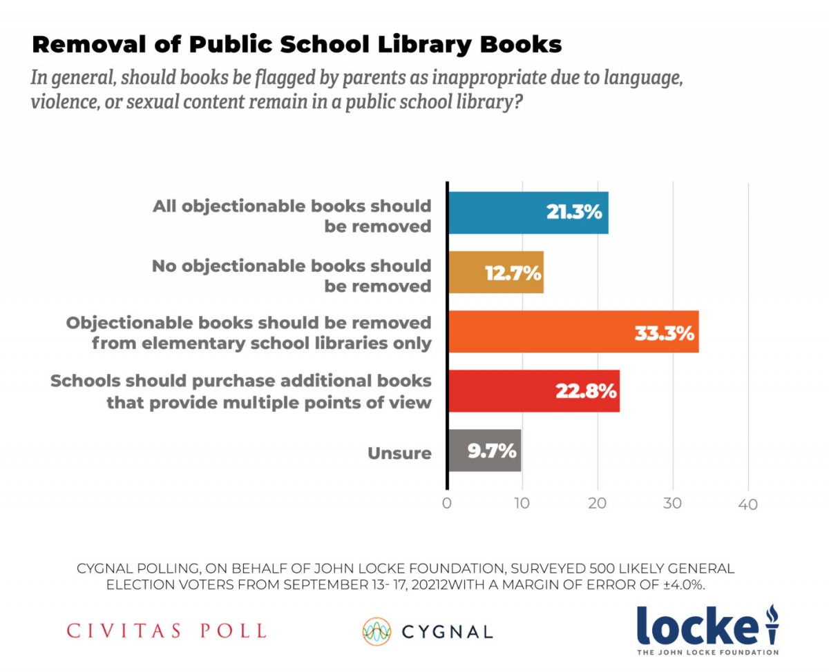 Controversial books, the teaching of sexual orientation and gender identity, and parental access to their child's medical and psychological information are some topics of greatest concern to parents and policymakers alike. School districts in North Carolina have handled these subjects in ways that have either affirmed or alienated parents. Poll results found support for school committees reviewing and removing objectionable books and spending less time teaching about sexual preference and gender identity. They also found deep and overwhelming support for providing parents access to their child's medical and psychological information. The third and final articles in this series will explore parents' views on teachers, what's going on inside their child's classrooms, and what parents think about local school boards.
