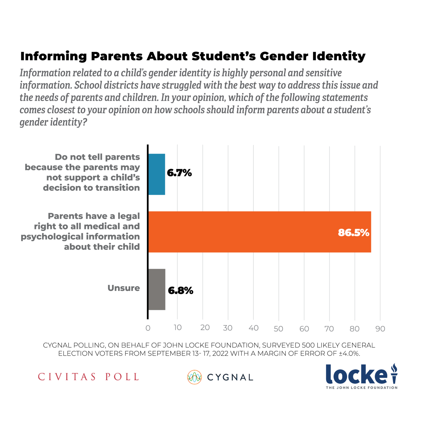 The response was overwhelming; 87 percent of respondents agreed that parents should be privy to all their child's medical and psychological information, including gender identity. Only about 7 percent of respondents would have schools not give this information to parents, out of concern the parents might not support a child's decision on gender identity. Another seven percent of respondents were unsure. There was very strong support (80 percent or above) in every category of respondents - grouping by sex, geography, party registration, race, education level, and income - for parents having the legal right to access all medical and psychological information about their child at levels of 80 percent or above. The only group below 80 percent support for this right was males over 65 years old (38 percent).
