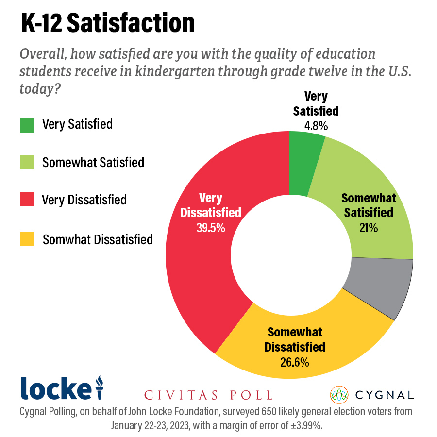 Poll results provide the public and school choice supporters with cause for both concern and hope. First the bad news. When asked how satisfied they were with the quality of education students are receiving in kindergarten through grade 12, nearly two-thirds of respondents (66.1 percent) chose
