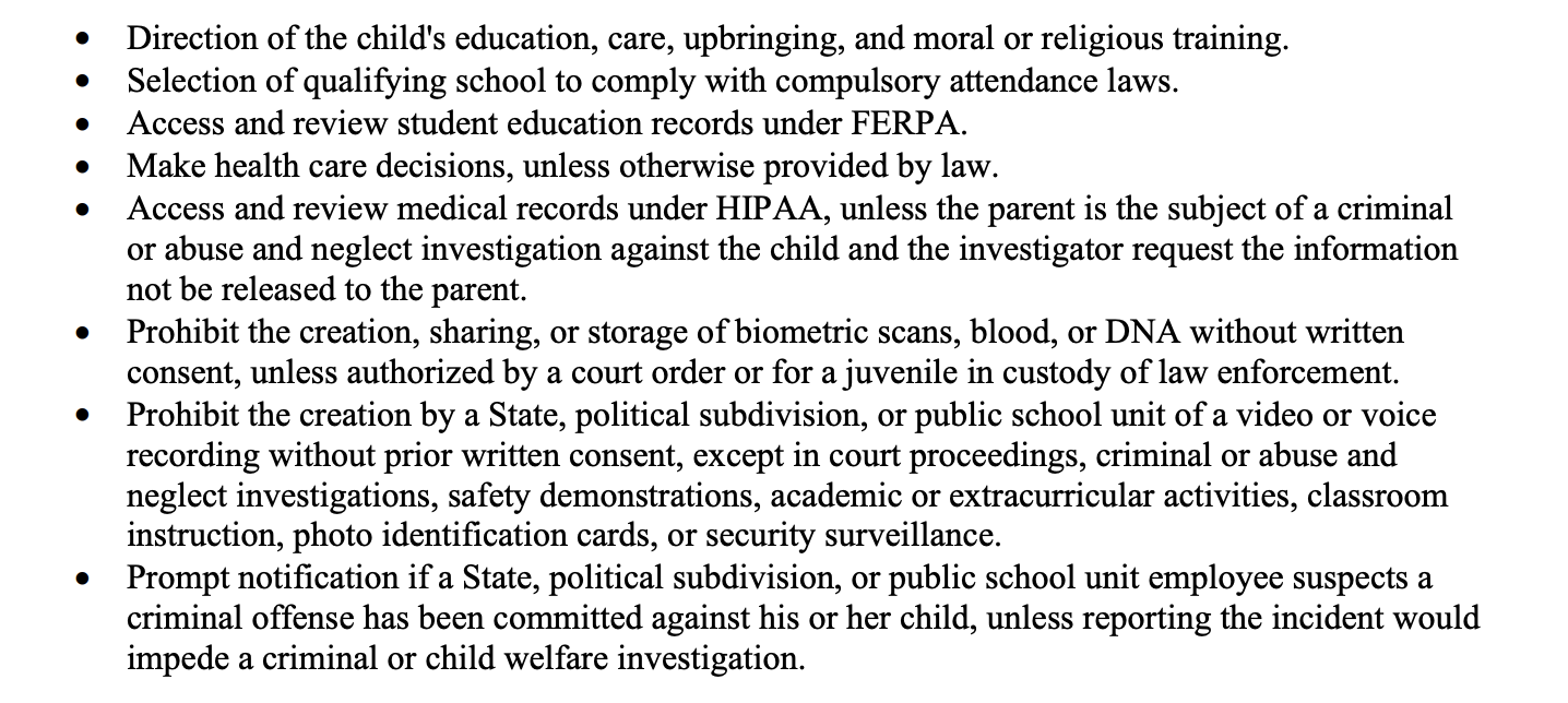 The Republican version of the bill would allow more parental oversight of materials and would require parents to be notified if their child wants to be called by a different name or new pronouns in school. The Republican bill grants parents the following rights:
