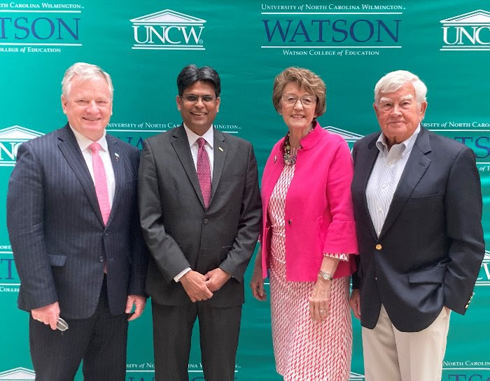 New UNC Wilmington Chancellor Aswani Volety welcomed members of the Local Government Commission to campus on Tuesday, April 4. The LGC held its monthly meeting at the college and members met with students afterwards. From left are State Treasurer Dale R. Folwell, Chancellor Volety, Secretary of State Elaine Marshall and Paul Butler.