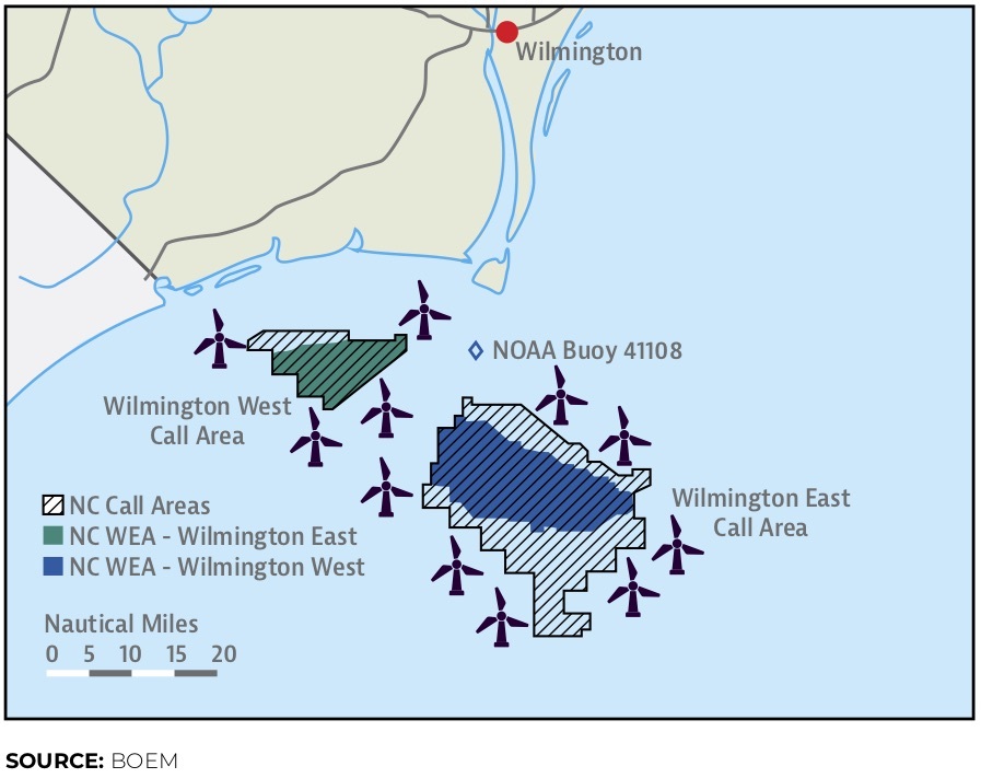 "Carolina Long Bay" wind energy areas, which would feature turbines 853 feet tall and be either 15 nautical miles offshore (Wilmington West) or nine nautical miles offshore (Wilmington East), and the Kitty Hawk wind energy area, which would feature turbines 1,042 feet tall and be 24 nautical miles from shore.