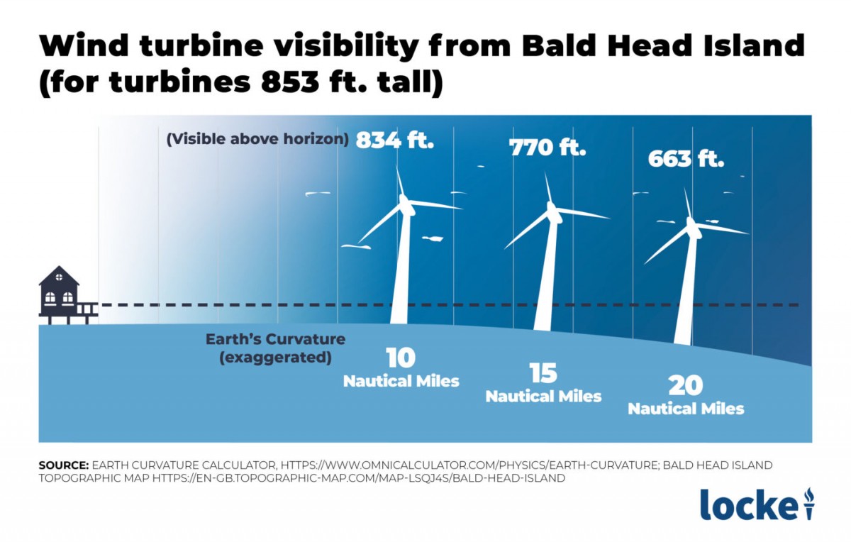 - At 15 nautical miles (the Wilmington East wind energy area off Bald Head Island), the upper 770 feet (90 percent) of those turbines would be visible from a beach house on stilts