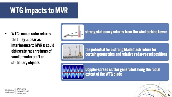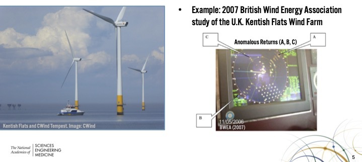 - In 2022 a major report from the National Academies of Sciences, Engineering, and Medicine warned that enormous wind turbines severely affect the marine vessel radar (MVR) used for navigating waterways shared by commercial and recreational vessels as well as extremely large commercial shipping vessels