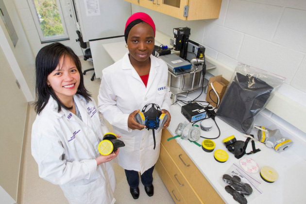 ECU professor Dr. JoAnne Balanay, left, and environmental health graduate student Adepeju Adesina are conducting research to develop a lighter respirator mask to improve workers' comfort levels and enhance their compliance with respirator regulations. (Photo by Jay Clark)|