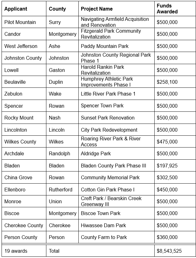 "Congratulations to the communities that received grants to create and expand their park facilities," said N.C. Department of Natural and Cultural Resources Secretary D. Reid Wilson. "Robust local outdoor recreation opportunities, in addition to our state and national parks, have helped North Carolina become the Great Trails State, and we look forward to seeing the outcome of these projects."