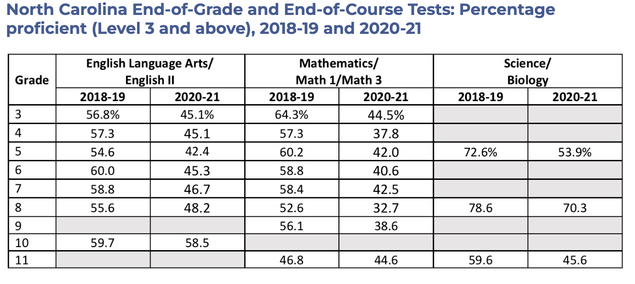 Research on the pandemic's effect on student enrichment shows that just forty-five percent of North Carolina's K-12 students passed state reading, math, and science exams.