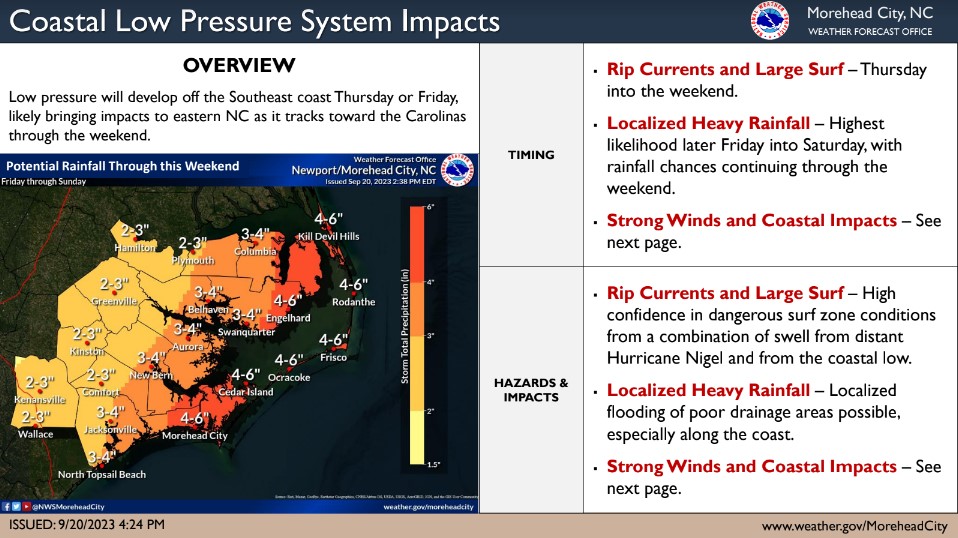 Impacts to eastern North Carolina are likely as low pressure develops off the Southeast coast over the next couple of days and tracks toward the Carolinas through the weekend. While the probability that this low will become tropical has increased a little to 40% (as of 2 PM), we want to emphasize that impacts are not directly related to whether or not this system gets named. Localized heavy rainfall is likely, especially along the coast, beginning Friday. However, the threat for strong winds and coastal impacts is very dependent on the track and strength of the low, and is very uncertain that this time. Please see the attached briefing for our latest thinking.