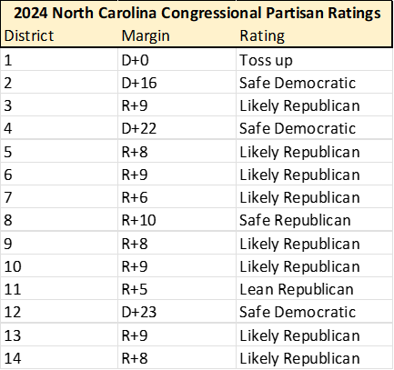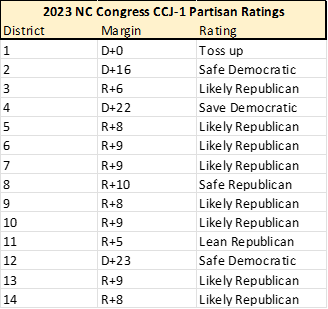 The map in SB 757 provides a Republican advantage in ten districts with three safe Democratic Districts. It also provides one highly competitive district (Rep Don Davis' First District). It is rated D+0, meanings that it has a Democratic leaning of less than half a percentage point. That part of the state is rapidly trending Republican, so it could soon be a difficult district for Davis to hold.