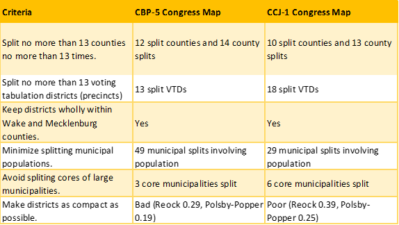 What the maps do with the 13th District is perhaps the most extreme example. On one map (CBP-5) it runs from northern Wake County all the way down to the beaches of Carteret County. On the other map (CCJ-1) the district is just as long but takes a long curve from the middle of the state before running along the Virginia line.
