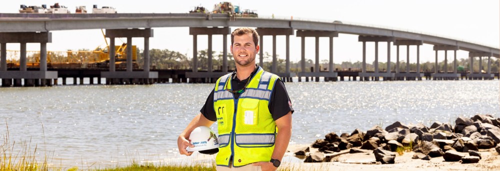 Will Janning, a 2016 ECU construction management graduate, works as a project engineer for Balfour Beatty, an international construction company that is building a new high-rise bridge that connects Harkers Island to mainland Carteret County. (Photo by Rhett Butler)