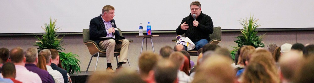 Sean Astin, actor and mental health advocate, spoke to on audience of nearly 1,000 on ECU’s campus during the 2023-24 Voyages of Discovery series “Inspiring Hope and Healing.” (Photo by Steven Mantilla)
