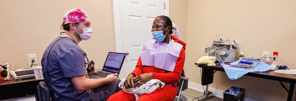 Patient Santana McCoy talks with resident Charles Haddock at the ECU School of Dental Medicine’s Hyde County clinic last year. (Photo by Cliff Hollis)