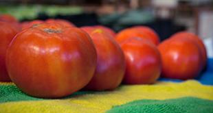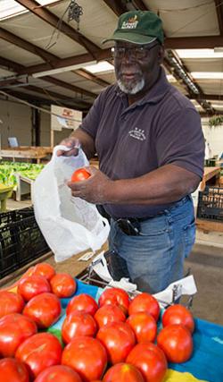 Samuel Hardy, whose wife owns a stand at the Pitt County Farmer's Market, selects ripe tomatoes for the ECU researchers to take home.