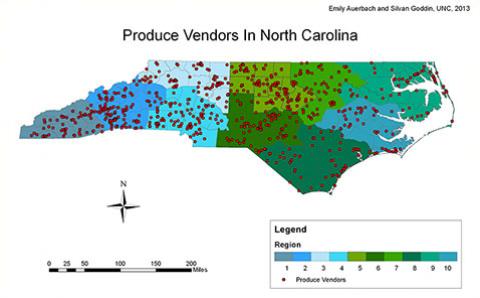 Identified on a North Carolina state map are vendors that sell healthy produce. Click on the image for a larger view.