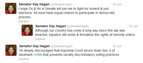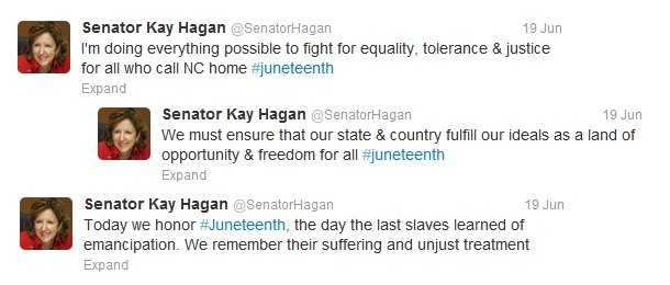 Of course, the lefties went bananas — foresaking thoughtful, intellectual discussion for profanity and name-calling. Our junior US Senator, Kay Hagan (D), carried the moaning, hyperbole, exaggeration, and teeth-gnashing to Twitter: