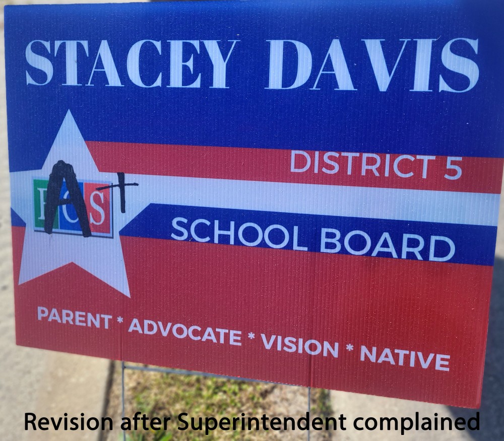 Stacey Davis responded to the October 2nd demands contending that she had done nothing wrong in using the public logo “BCS” to identify and inform the public about the board seat she is running for. There is some question as to whether or not the logo is protected to the point that she cannot use it. There are other legal principles that allow the use of protected logos, symbols and creative items. Beyond the legal nitty gritty it would seem that a candidate for a seat on the school board has as much right to use the logo as does anyone else. One might argue that the logo belongs to the taxpayers as much as it does to anyone.