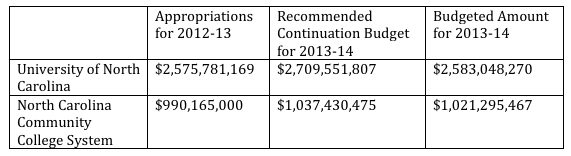 A Small Increase in Funding: The budget bill, which Governor McCrory signed Friday, increases the amount of funding that the UNC and community college systems will receive. For the last fiscal year (July 2012 to June 2013), the two systems were appropriated $2.576 billion and $990 million, respectively. If McCrory signs the new bill, UNC will receive $2.583 billion and the community colleges will receive $1.021 billion.