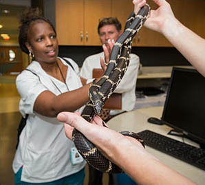 To mixed reactions, Bush showed an eastern king snake to staff at Vidant Medical Center.