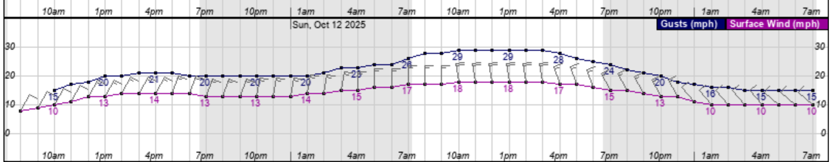 - Our highest winds are forecasted to occur Saturday and Sunday, with frequent gust of 20 to 30 mph likely.