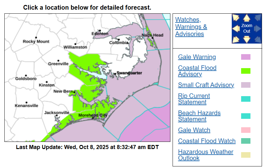 A Coastal Flood Advisory has been issued for our area through Monday, with water levels forecasted to be 1 to 2 feet above normal levels. Shorelines vulnerable to sustained northly winds and low-lying areas vulnerable to King Tides should expect these higher than normal water levels from Thursday to early Monday morning. These waterways should begin to return to normal levels as we move through the day on Monday.