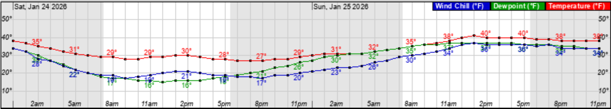 Hourly wind chill (Blue Line) graphic for Saturday & Sunday