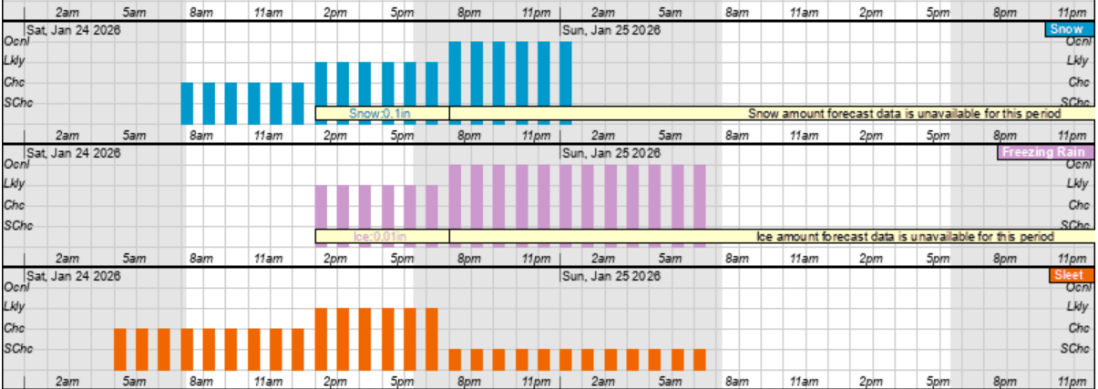 Saturday Snow (blue), Freezing Rain (pink) and Sleet (orange) Hourly Graphic