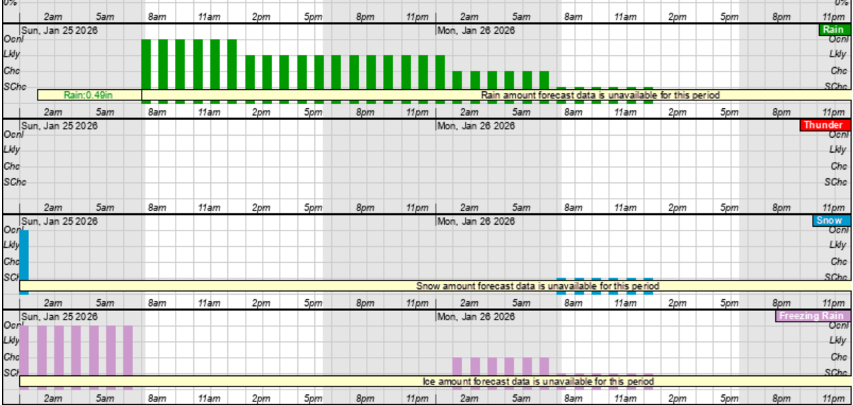 Sunday's Rain (green), Snow (blue) and Freezing Rain (pink) Hourly Graphic
