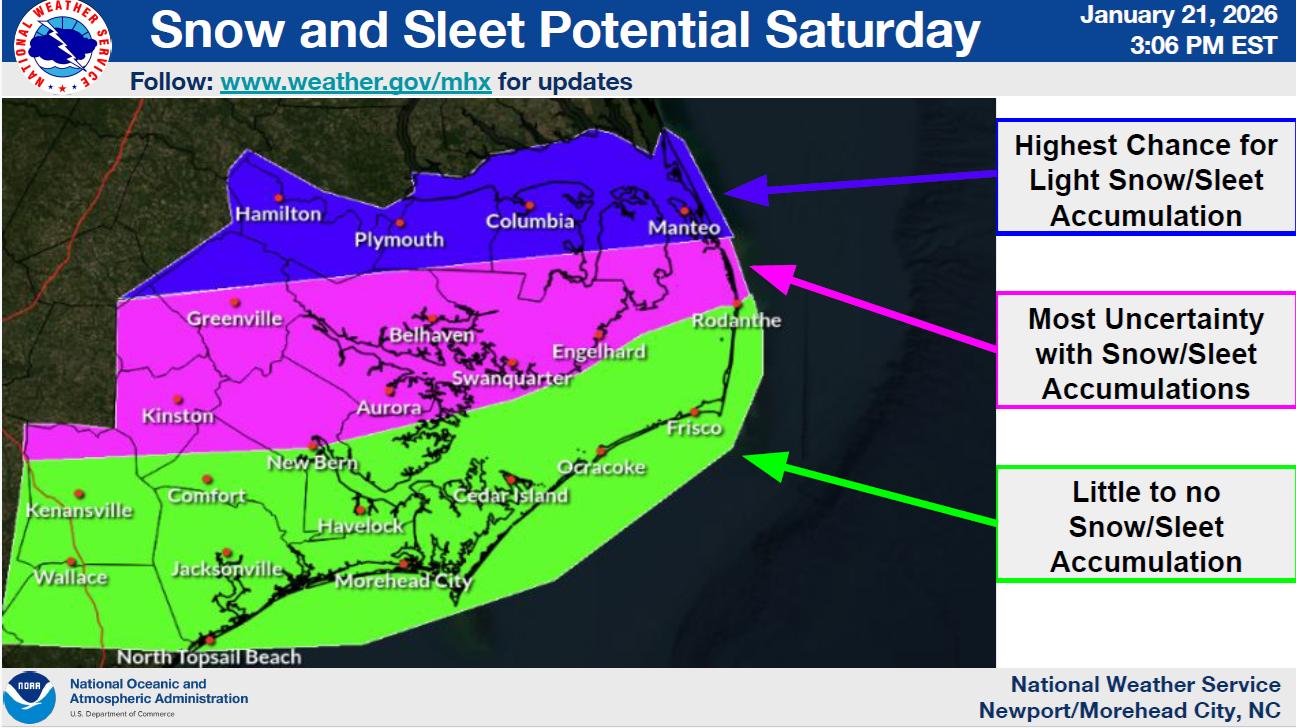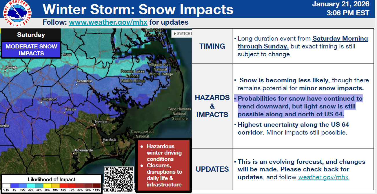 Today's weather updates have suggested slightly warmer temperatures for our area than was previously forecasted, which is shifting significant snow and freezing rain accumulations further west and north. Forecast changes for Beaufort County have been