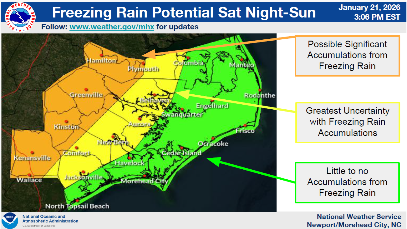 - Beaufort County is included within the area of greatest uncertainty for freezing rain accumulations.