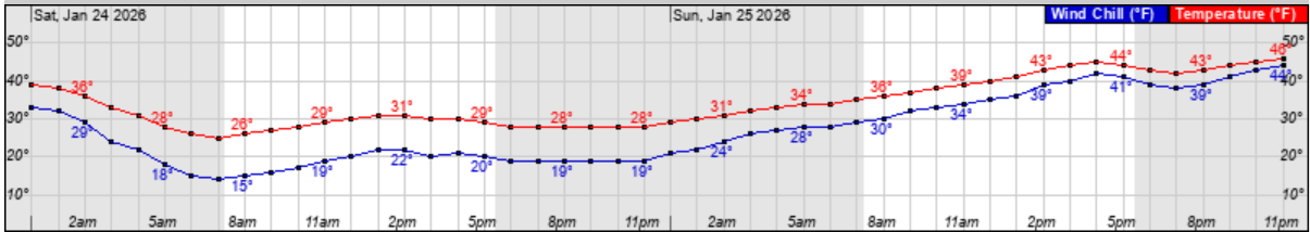 Hourly wind chill (Blue Line) graphic for Saturday & Sunday