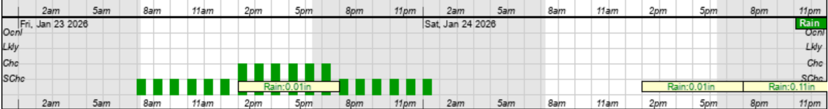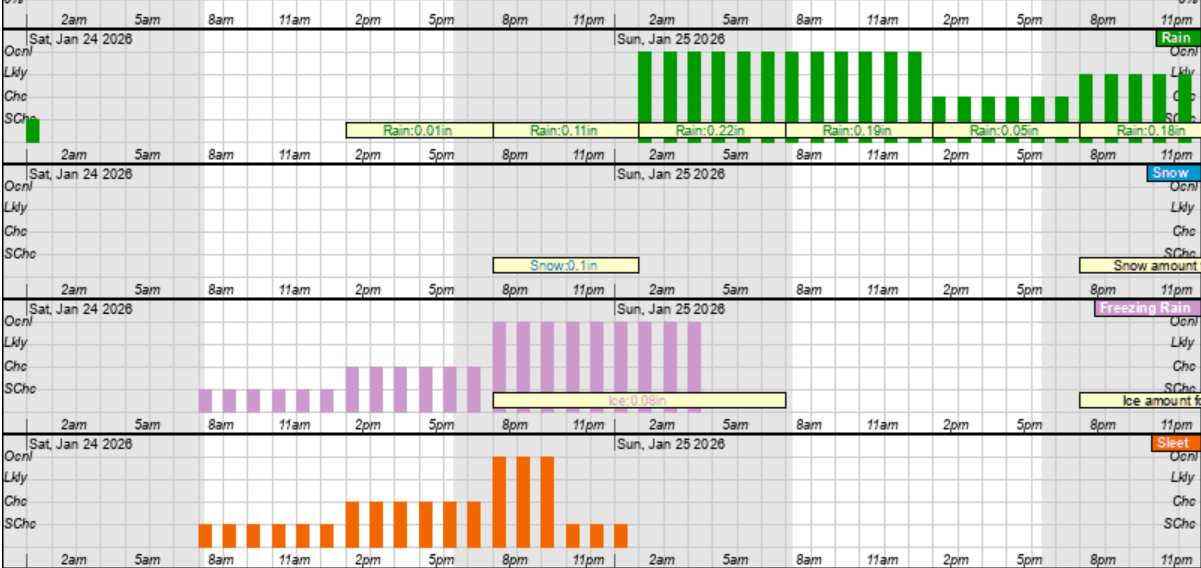 Saturday & Sunday - Freezing Rain (pink), Sleet (orange) and Rain (green) Hourly Graphic