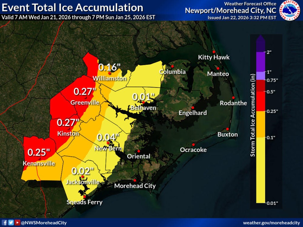 This afternoon's update continues to shift winter weather impacts further west and north, with Beaufort County now forecasted to receive less than 1/8 of an inch of accumulating ice from freezing rain, and little to no measurable snow. Changes from our previous briefing have been
