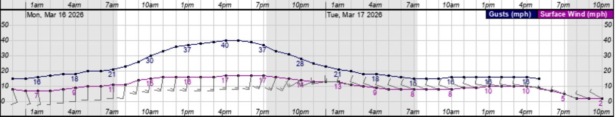 - South winds of 15 to 20 mph are expected between 10am and 10pm tomorrow, with frequent gust of 40 to 45 mph likely.